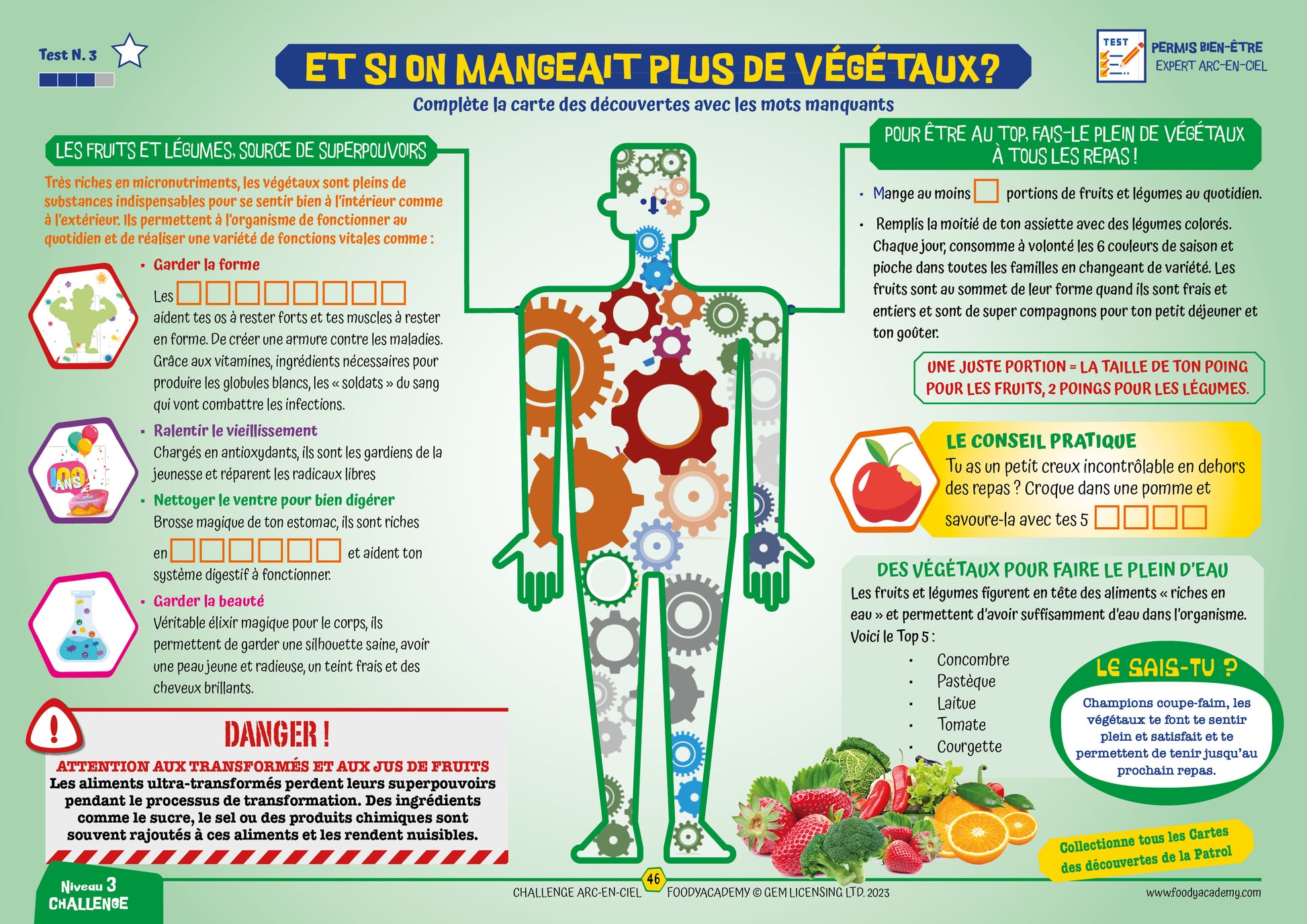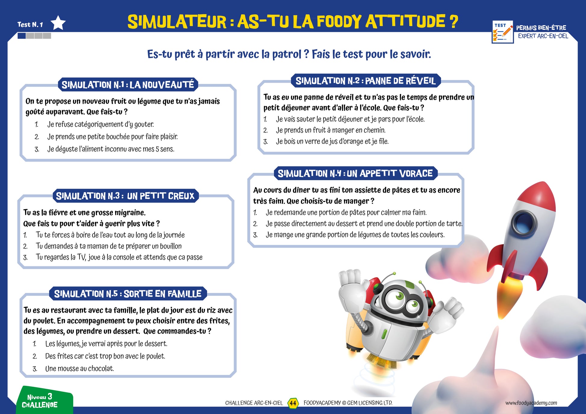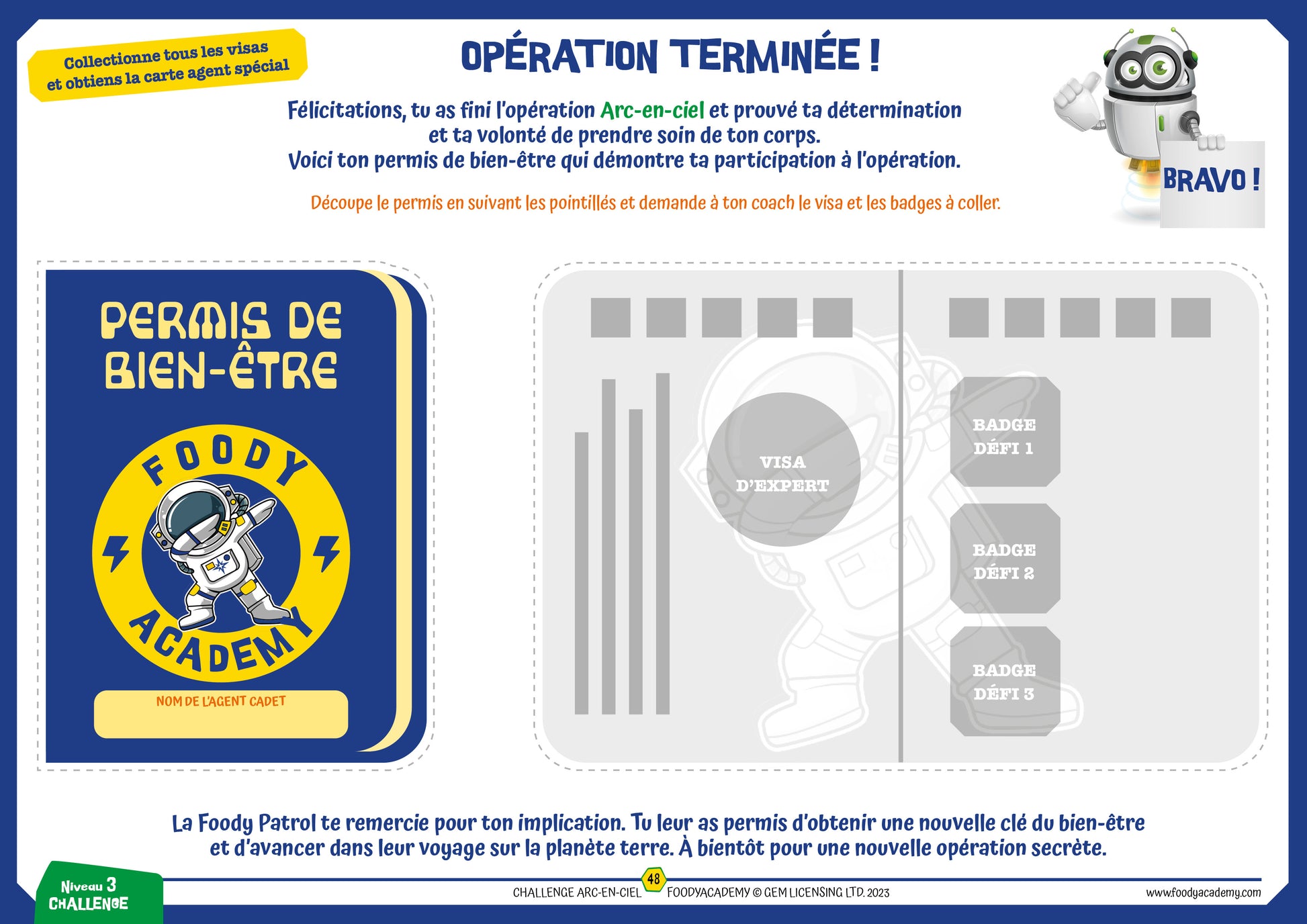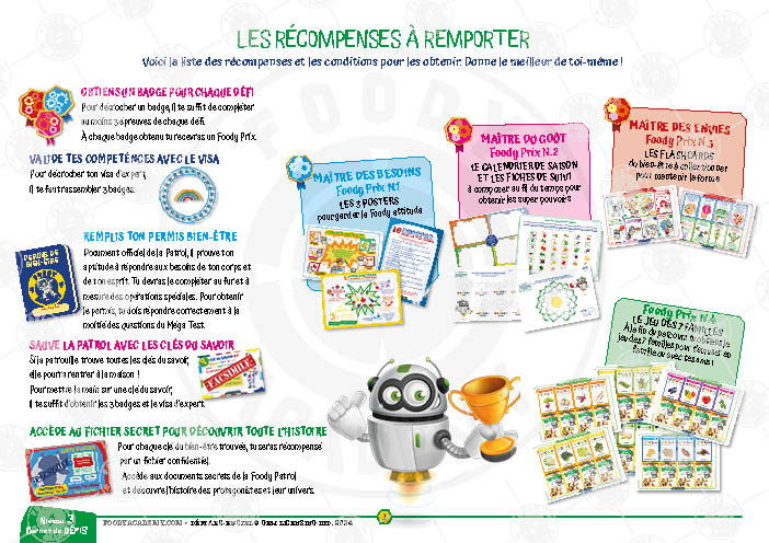 Votre enfant devra compléter de nombreuses épreuves pour décrocher les Badges, le Permis de Bien-Être et obtenir toutes les récompenses bonus en fin de parcours.