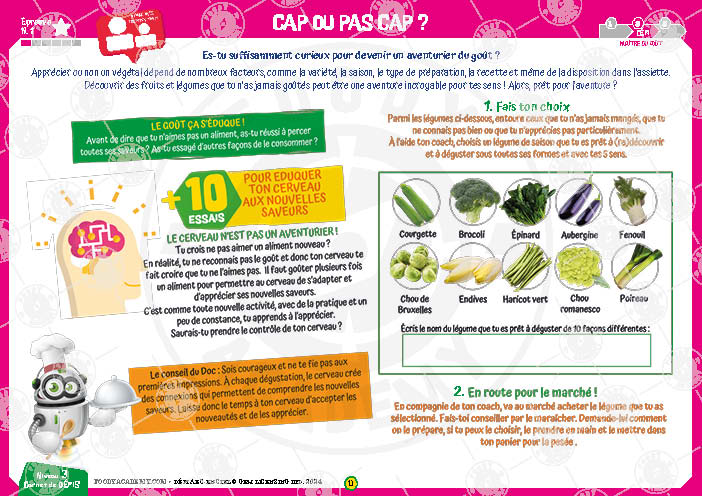 Avec ce carnet de défis, riche épreuves de toutes sortes, à faire seuls et en famille, les enfants vont devoir prouver leurs compétences et leur détermination pour aller vers une alimentation saine.